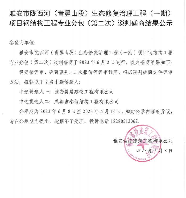 雅安市隴西河(青鼻山段)生態(tài)修復(fù)治理工程(一期)項(xiàng)目鋼結(jié)構(gòu)工程專業(yè)分包(第二次)談判磋商結(jié)果公示