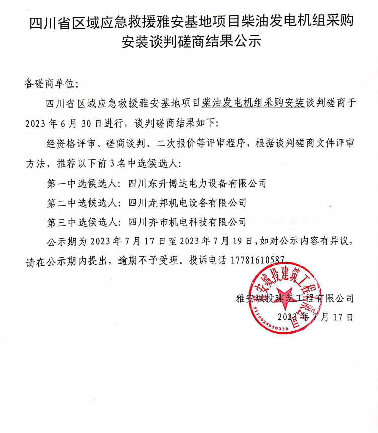 四川省區(qū)域應(yīng)急救援雅安基地項(xiàng)目柴油發(fā)電機(jī)組采購安裝談判磋商結(jié)果公示