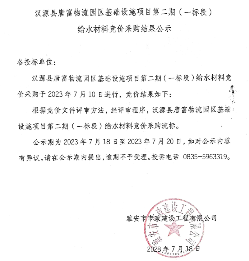漢源縣唐富物流園區(qū)基礎(chǔ)設(shè)施項(xiàng)目二期(一標(biāo)段)給水材料競價(jià)采購結(jié)果公示