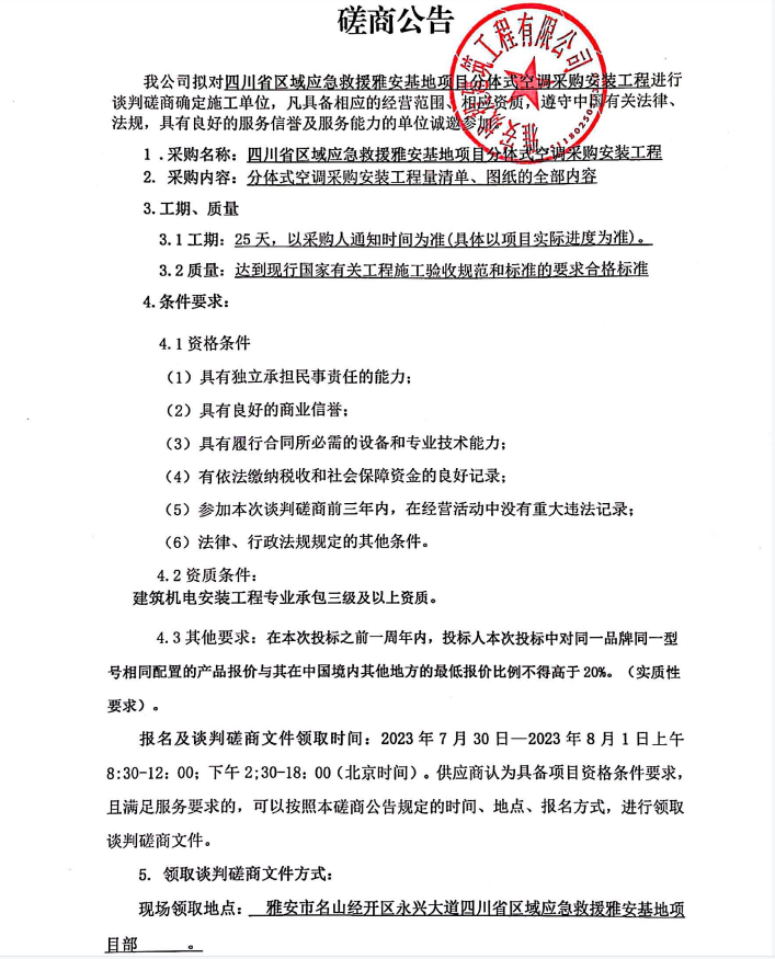 四川省區(qū)域應(yīng)急救援雅安基地項目分體式空調(diào)采購安裝工程談判磋商公告