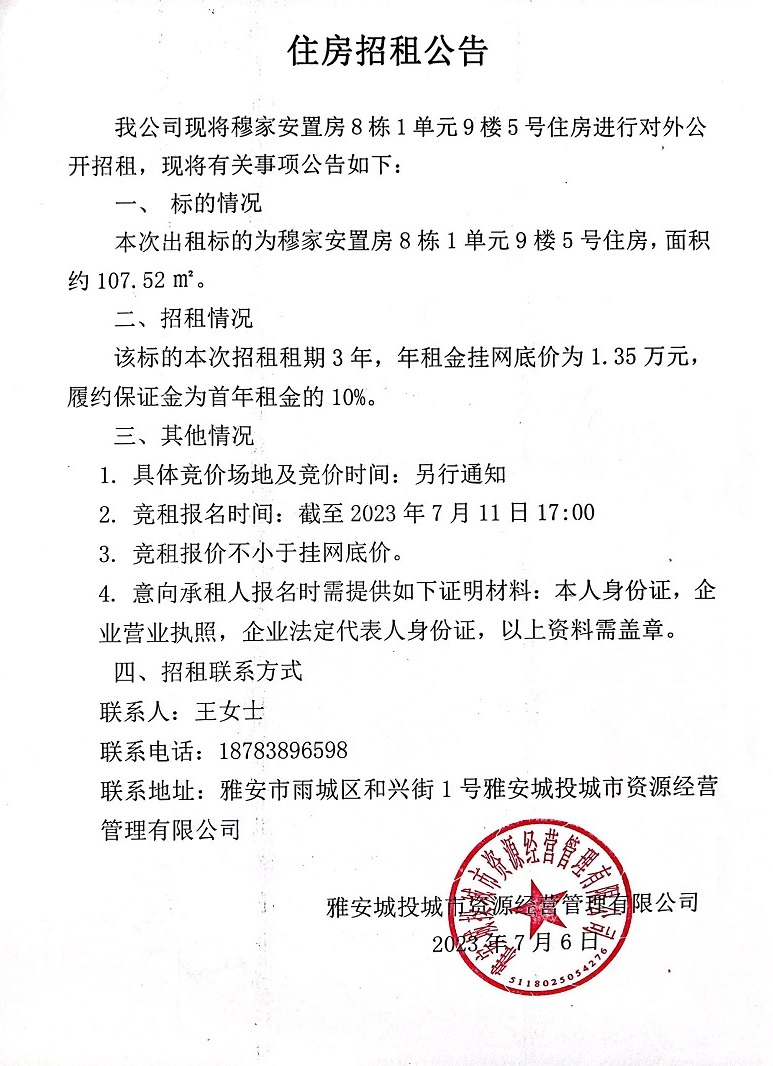 穆家安置房8棟1單元9樓5號住房招租公告