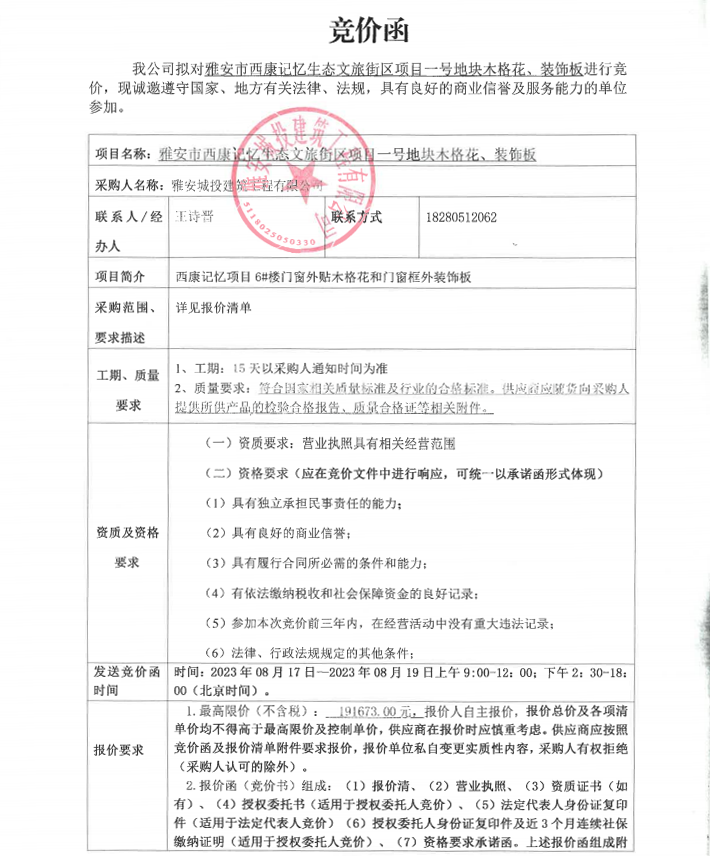 雅安市西康記憶生態(tài)文旅街區(qū)項(xiàng)目一號(hào)地塊木格花、裝飾板采購(gòu)競(jìng)價(jià)公告