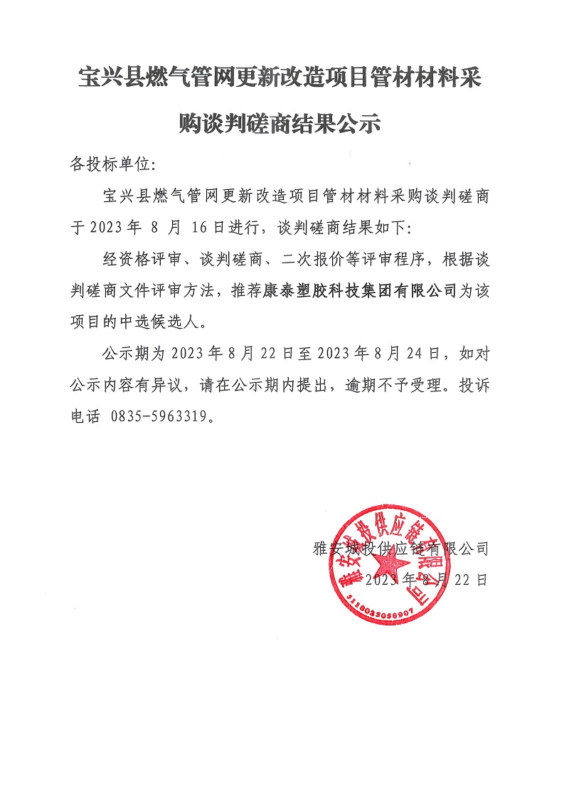 寶興縣燃?xì)夤芫W(wǎng)更新改造項目管材材料采購談判磋商結(jié)果公示