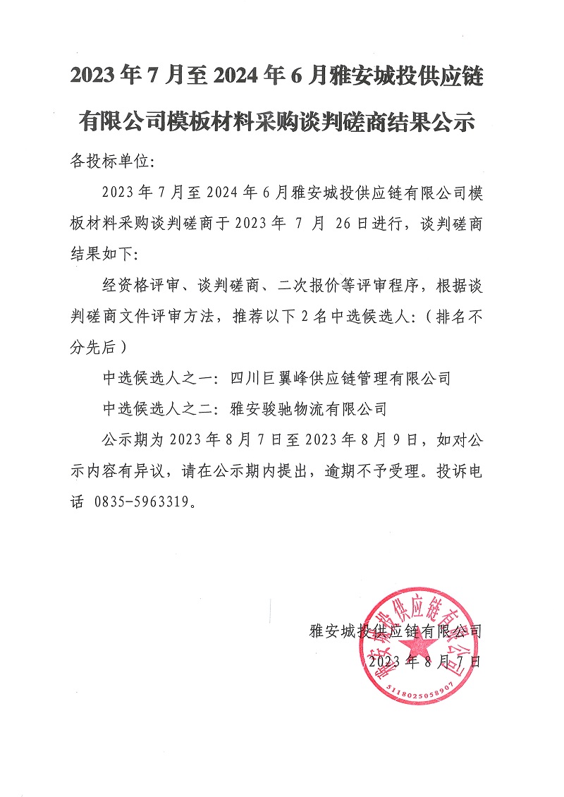 2023年7月至2024年6月雅安城投供應(yīng)鏈有限公司模板材料采購談判磋商結(jié)果公示