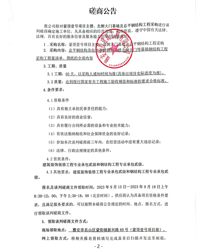 蒙頂壹號項(xiàng)目主樓、北側(cè)大門幕墻及總平鋼結(jié)構(gòu)工程采購談判磋商公告