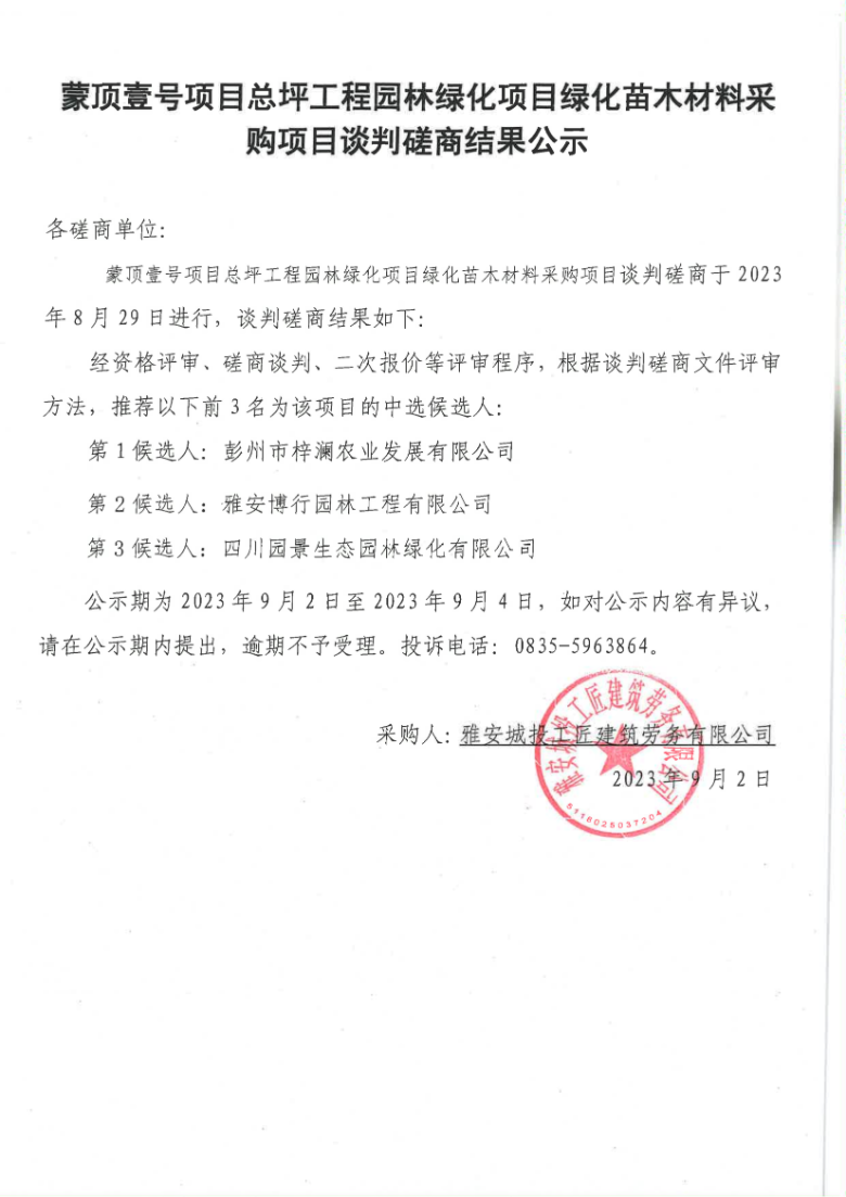 蒙頂壹號項(xiàng)目總坪工程園林綠化項(xiàng)目綠化苗木材料采購項(xiàng)目談判磋商結(jié)果公示