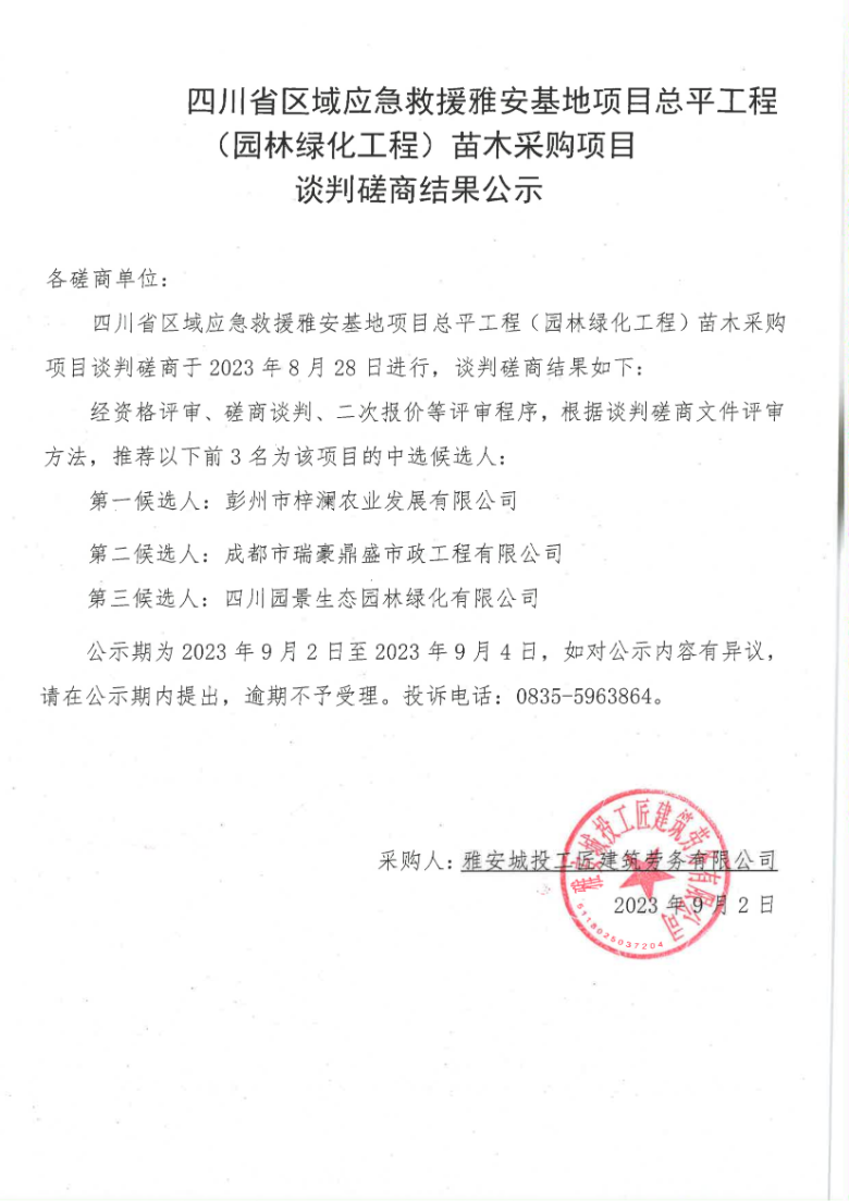 四川省區(qū)域應(yīng)急救援雅安基地項(xiàng)目總平工程(園林綠化工程)苗木采購項(xiàng)目談判磋商結(jié)果公示