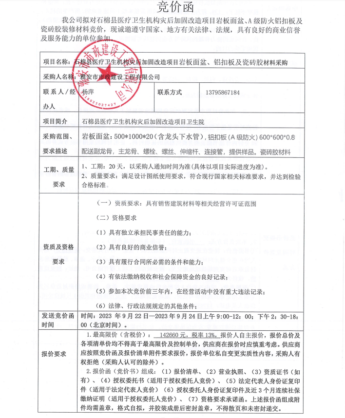石棉縣醫(yī)療衛(wèi)生機(jī)構(gòu)災(zāi)后加固改造項(xiàng)目巖板面盆、A級(jí)防火鋁扣板及瓷磚膠材料采購競價(jià)公告