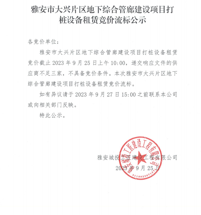 雅安市大興片區(qū)地下綜合管廊建設項目打樁設備租賃競價流標公示