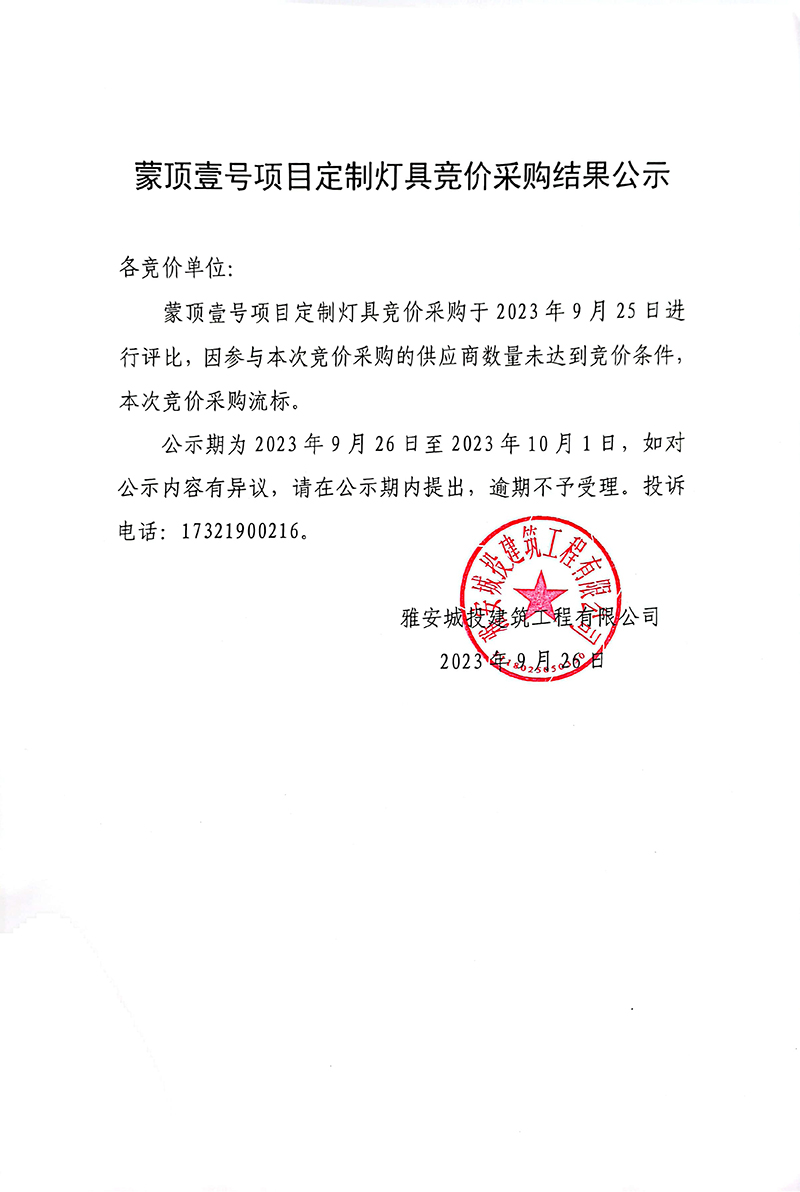蒙頂壹號(hào)項(xiàng)目定制燈具競價(jià)采購結(jié)果公示