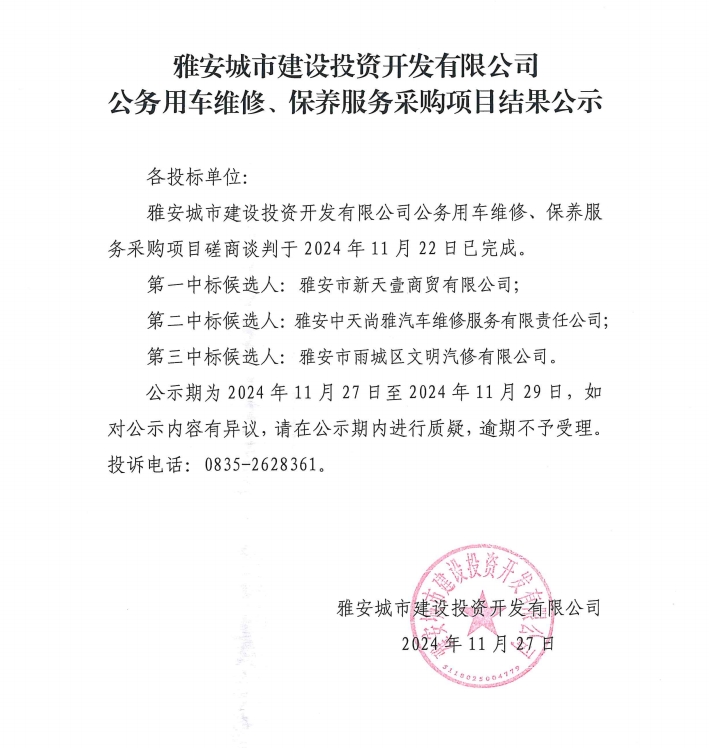 雅安城市建設投資開發(fā)有限公司公務用車維修、保養(yǎng)服務采購項目結(jié)果公示