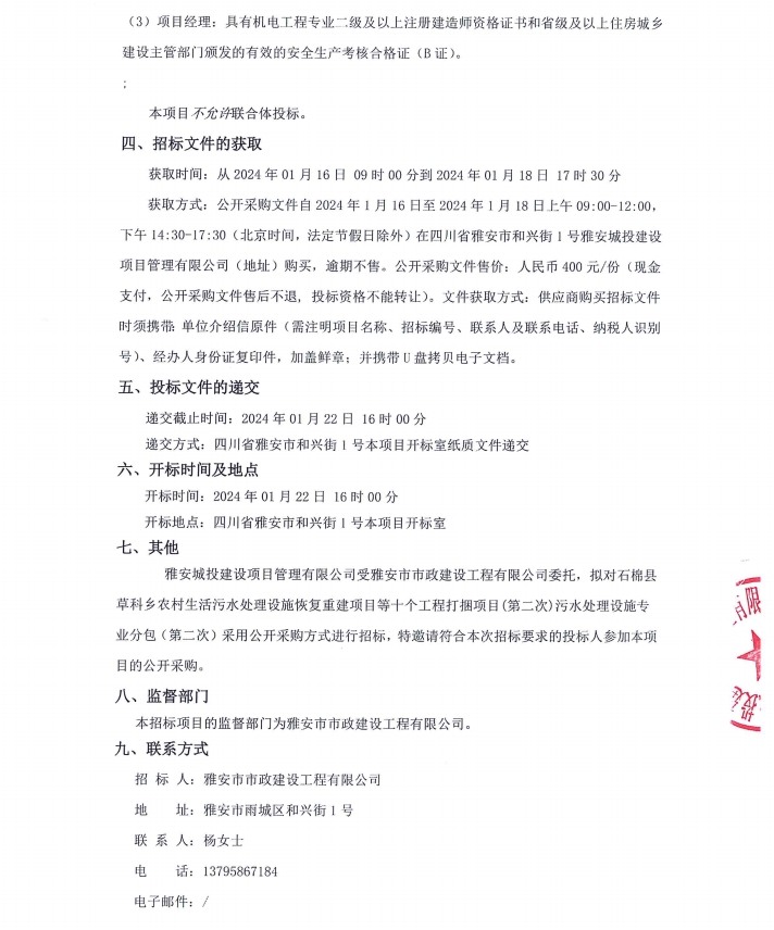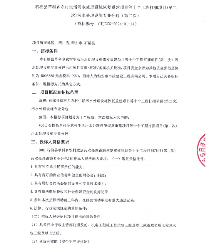 石棉縣草科鄉(xiāng)農(nóng)村生活污水處理設施恢復重建項目等十個工程打捆項目(第二次)污水處理設施專業(yè)分包競價公告