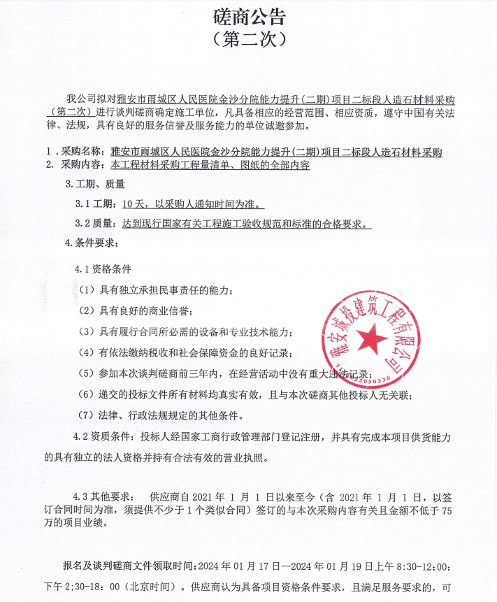 雅安市雨城區(qū)人民醫(yī)院金沙分院能力提升(二期)項(xiàng)目二標(biāo)段人造石材料(第二次)采購(gòu)談判磋商公告