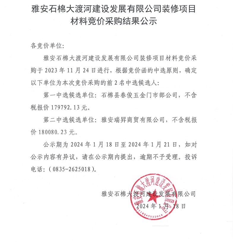 雅安石棉大渡河建設(shè)發(fā)展有限公司裝修材料競價采購結(jié)果公示
