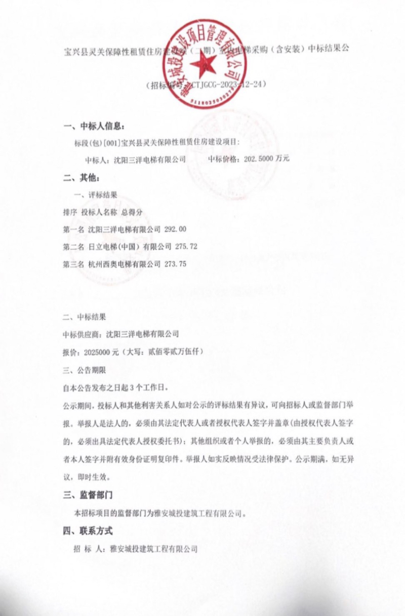 寶興縣靈關(guān)保障性租賃住房建設(shè)項目(二期)室內(nèi)電梯采購(含安裝)中標(biāo)結(jié)果公示