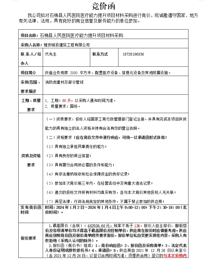 石棉縣人民醫(yī)院醫(yī)療能力提升項(xiàng)目消防材料(二次)采購競價公告