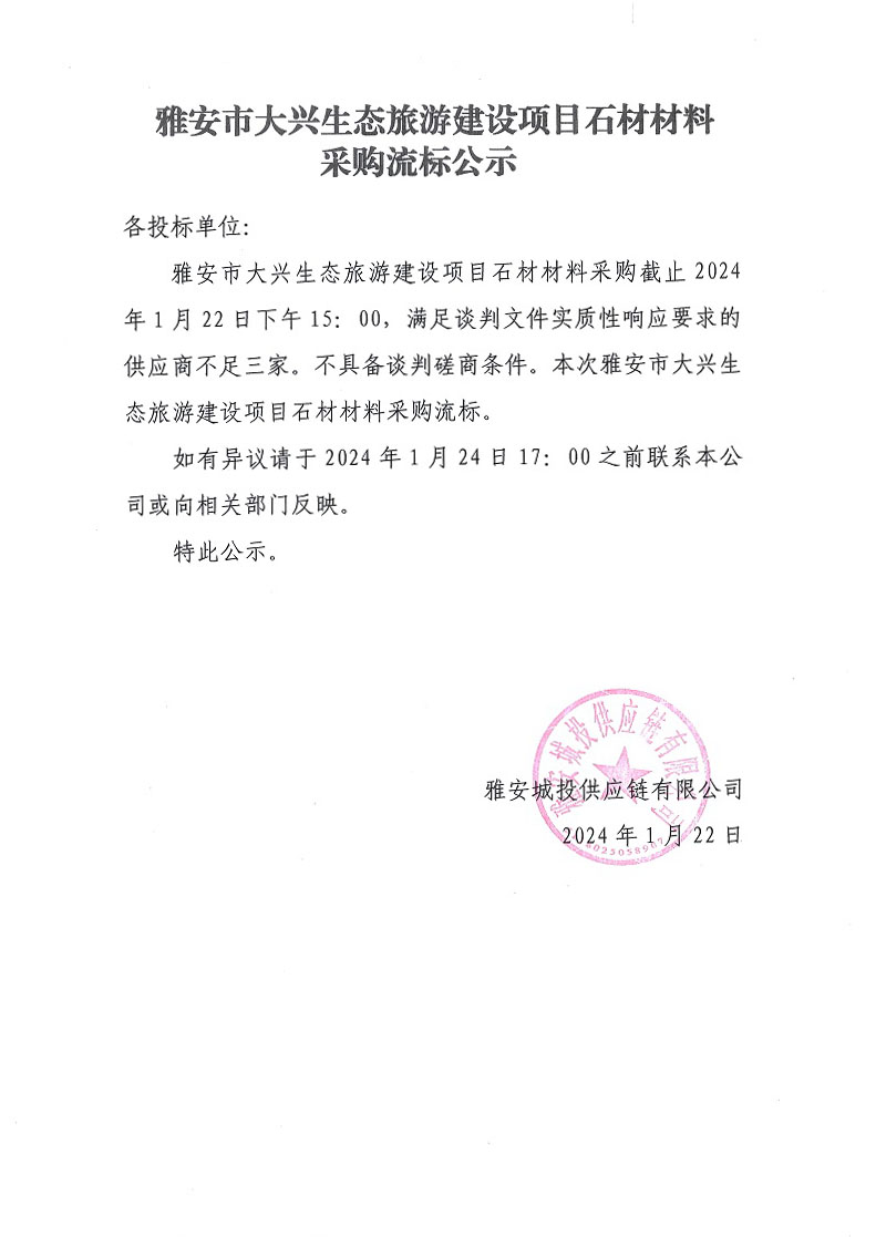 雅安市大興生態(tài)旅游建設項目石材材料采購流標公示