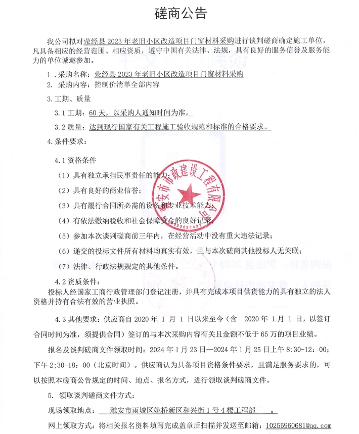 滎經(jīng)縣2023年老舊小區(qū)改造項(xiàng)目門(mén)窗材料采購(gòu)談判磋商公告