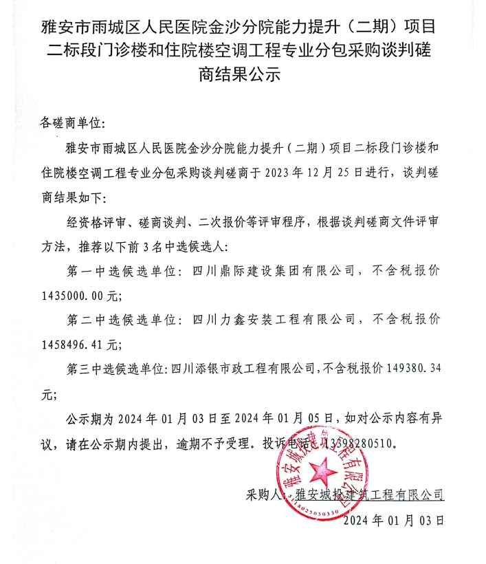 雅安市雨城區(qū)人民醫(yī)院金沙分院能力提升(二期)項(xiàng)目二標(biāo)段門(mén)診樓和住院樓空調(diào)工程專(zhuān)業(yè)分包采購(gòu)談判磋商結(jié)果公示
