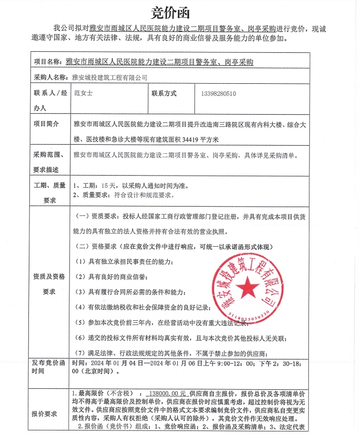 雅安市雨城區(qū)人民醫(yī)院能力建設(shè)二期項目警務(wù)室、崗?fù)げ少徃們r公告