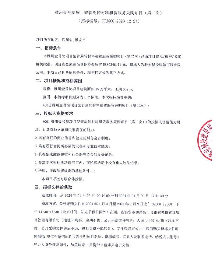 雅州壹號院項(xiàng)目架管周轉(zhuǎn)材料租賃服務(wù)采購項(xiàng)目(第二次)公告