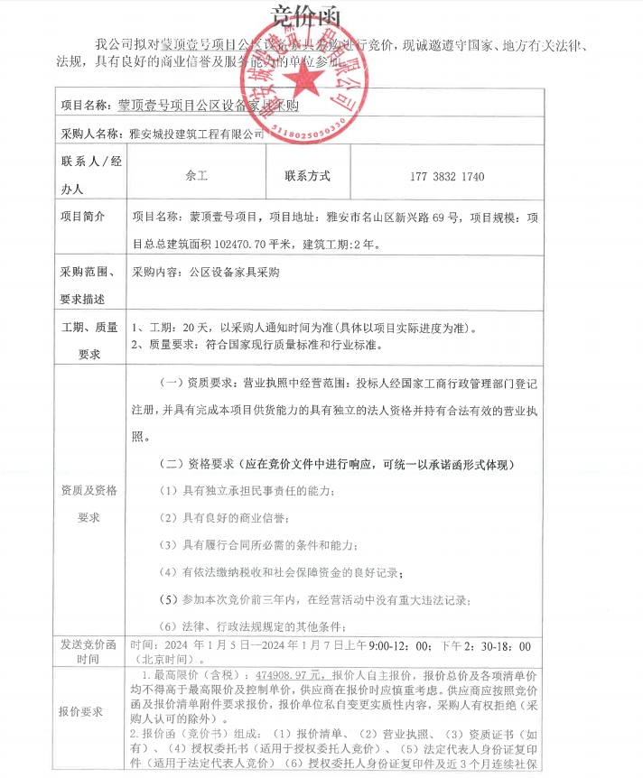 蒙頂壹號項(xiàng)目公區(qū)設(shè)備家具采購競價公告