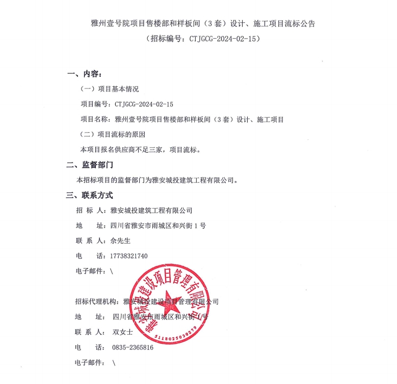 雅州壹號院項(xiàng)目售樓部和樣板間(3套)設(shè)計(jì)、施工項(xiàng)目流標(biāo)公告