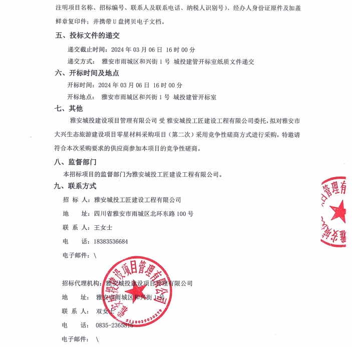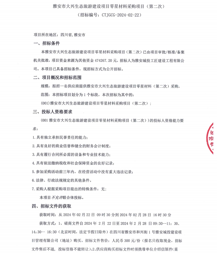 雅安市大興生態(tài)旅游建設(shè)項(xiàng)目零星材料采購(gòu)項(xiàng)目(第二次)公告