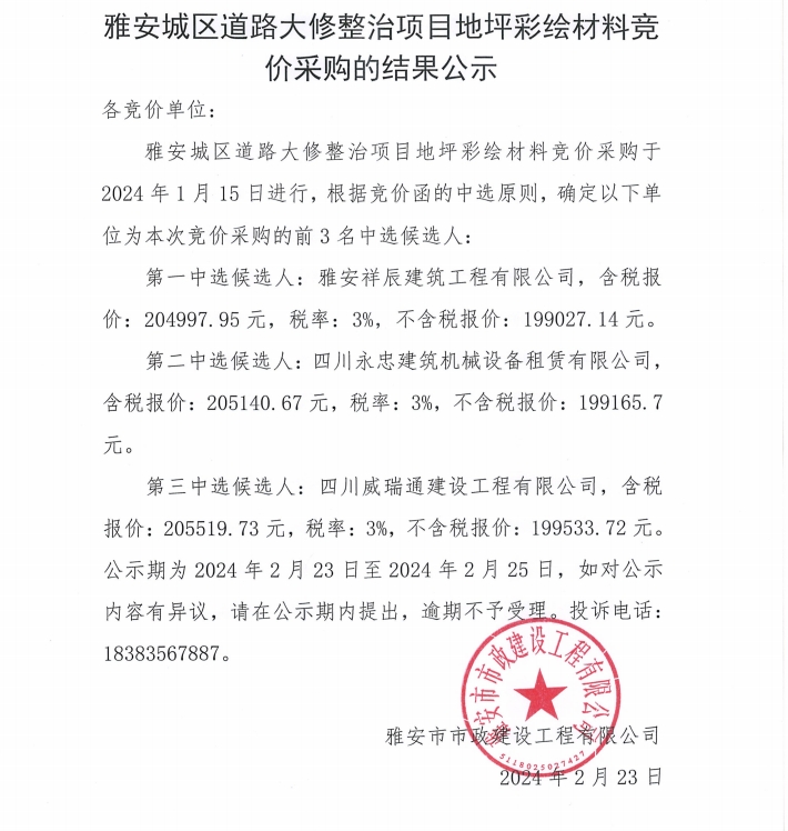 雅安城區(qū)道路大修整治項(xiàng)目地坪彩繪材料競價(jià)采購的結(jié)果公示