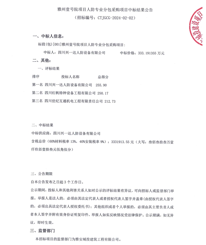 雅州壹號(hào)院項(xiàng)目人防專業(yè)分包采購項(xiàng)目中標(biāo)結(jié)果公告