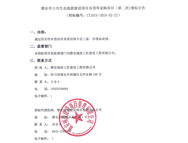 雅安市大興生態(tài)旅游建設(shè)項(xiàng)目吊頂?shù)炔少忢?xiàng)目(第二次)廢標(biāo)公告