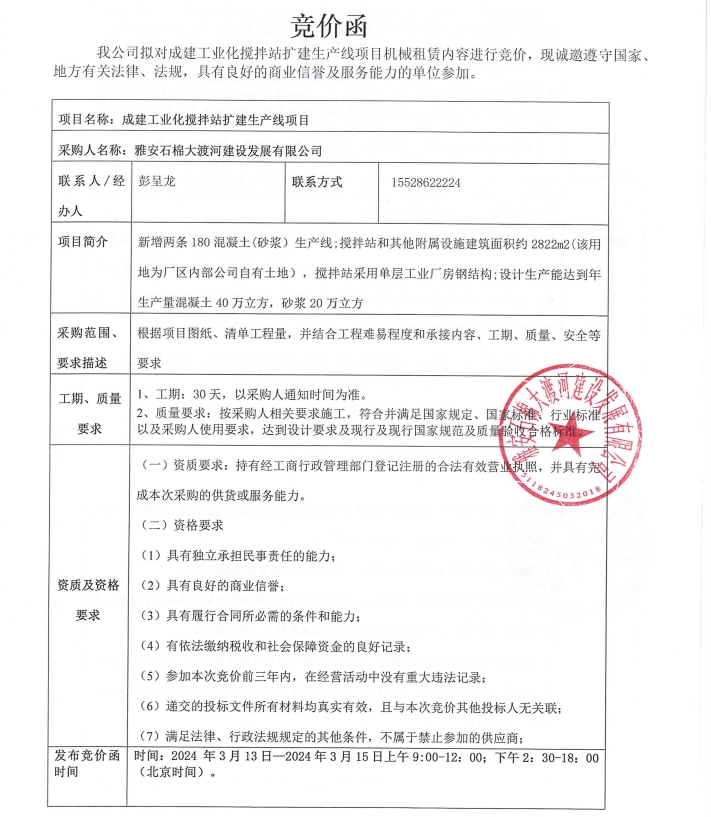 成建工業(yè)化攪拌站擴建生產(chǎn)線項目機械租賃內(nèi)容競價公告