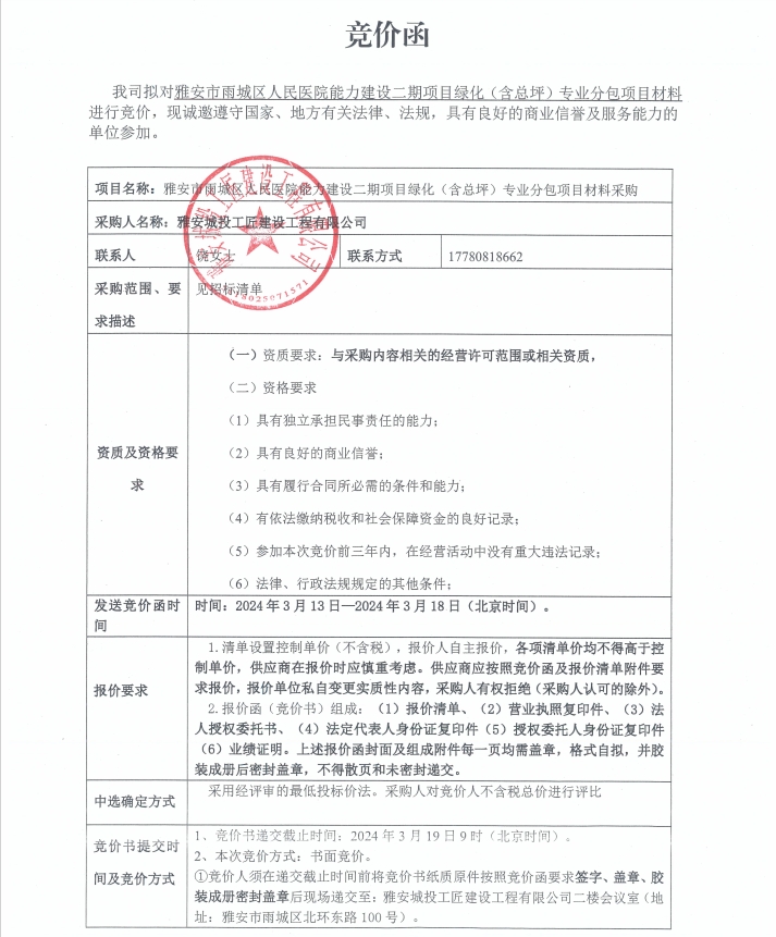 雅安市雨城區(qū)人民醫(yī)院能力建設(shè)二期項目綠化(含總坪)專業(yè)分包項目材料采購競價公告