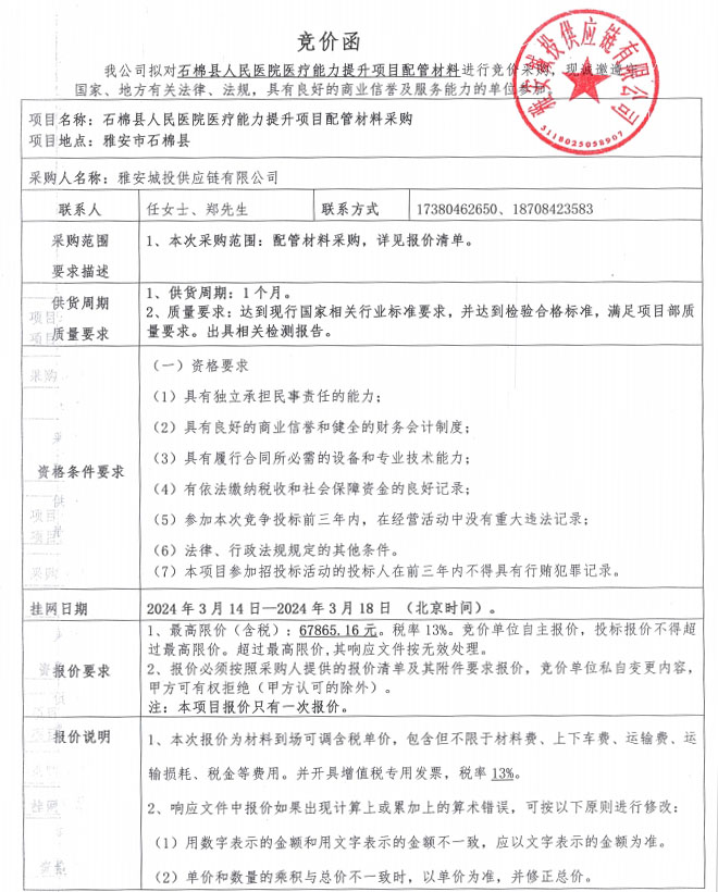石棉縣人民醫(yī)院醫(yī)療能力提升項目配管材料競價公告