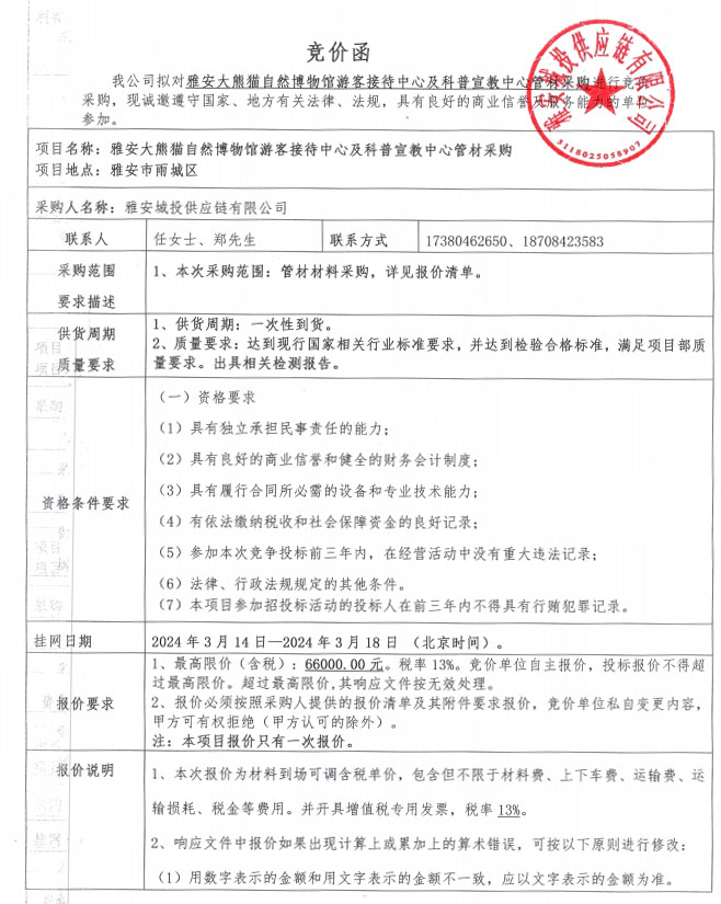 雅安大熊貓自然博物館游客接待中心及科普宣教中心管材采購競價公告
