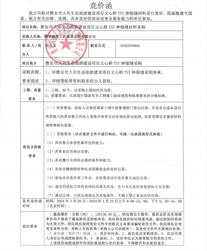 雅安市大興生態(tài)旅游建設(shè)項目文心橋TST橋梁伸縮縫材料采購競價公告