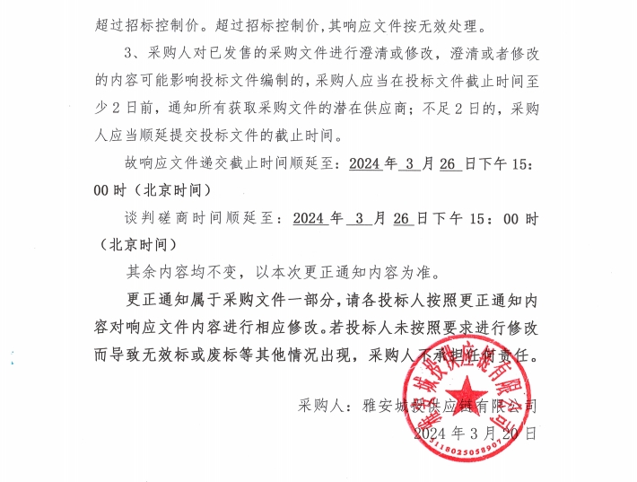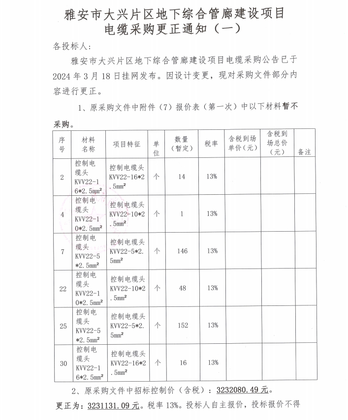雅安市大興片區(qū)地下綜合管廊建設(shè)項目電纜采購更正通知(一)