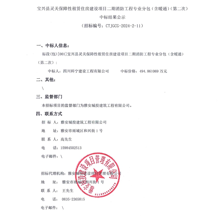 寶興縣靈關保障性租賃住房建設項目二期消防工程專業(yè)分包(含暖通)(第二次)中標結果公示