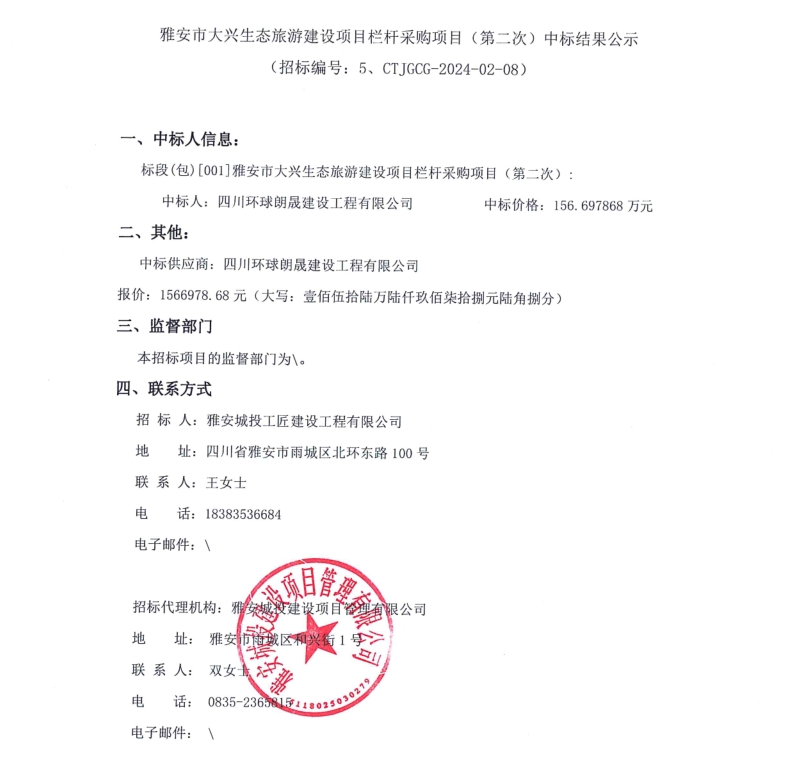 雅安市大興生態(tài)旅游建設(shè)項目欄桿采購項目(第二次)中標(biāo)結(jié)果公示