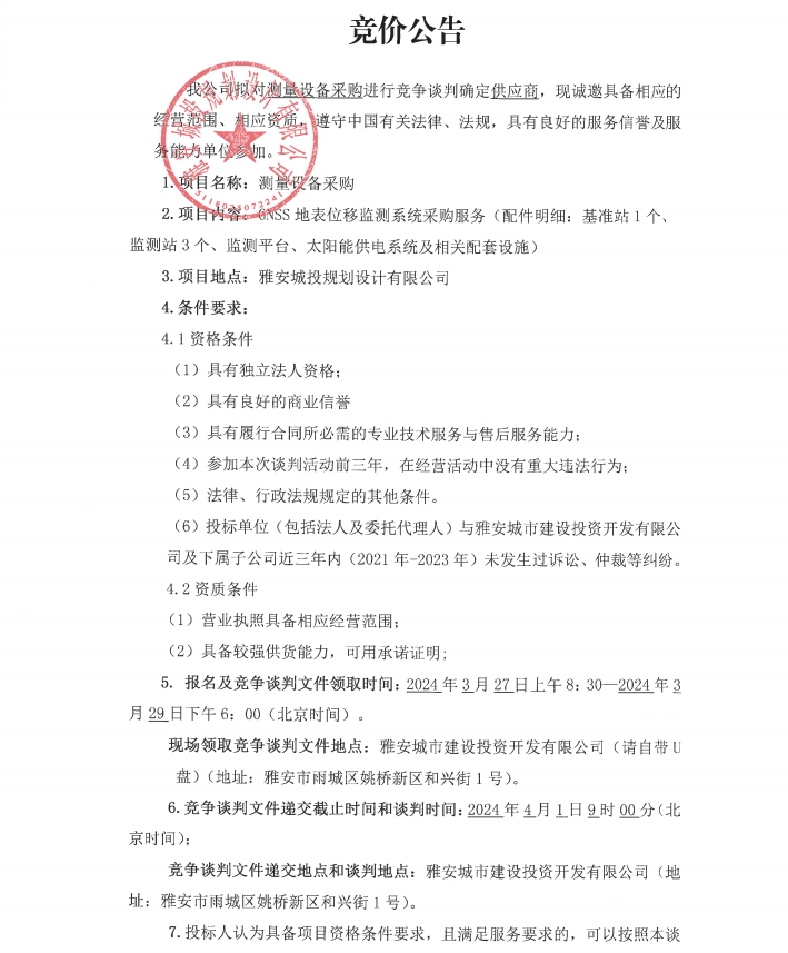 測量設備GNSS地表位移監(jiān)測系統(tǒng)采購競價公告