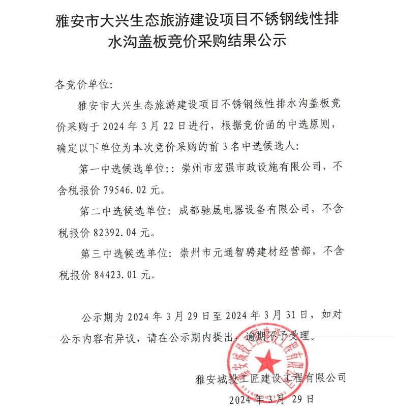 雅安市大興生態(tài)旅游建設(shè)項目不銹鋼線性排水溝蓋板競價采購結(jié)果公示