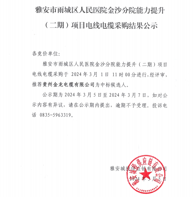 雅安市雨城區(qū)人民醫(yī)院金沙分院能力提升(二期)項目電線電纜采購結(jié)果公示