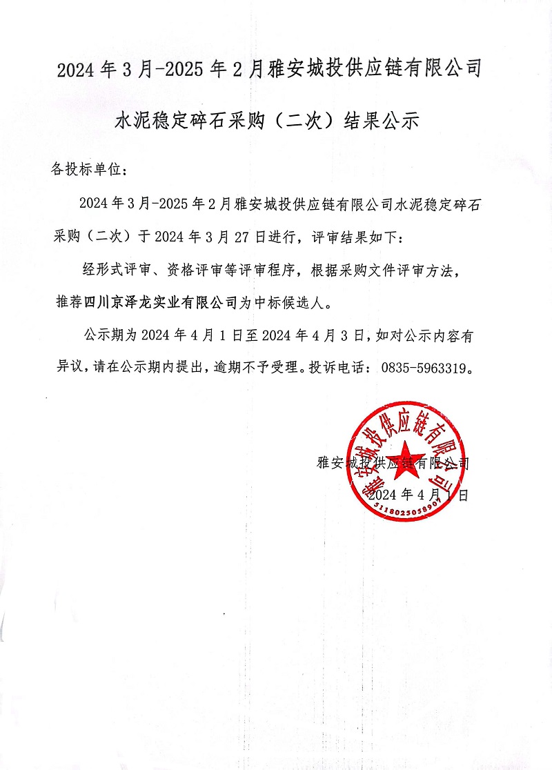 2024年3月-2025年2月雅安城投供應(yīng)鏈有限公司水泥穩(wěn)定碎石采購(二次)結(jié)果公示