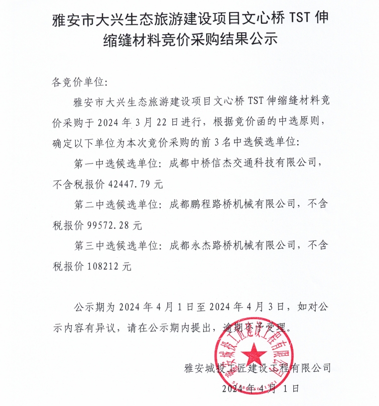 雅安市大興生態(tài)旅游建設(shè)項(xiàng)目文心橋TST伸縮縫材料競(jìng)價(jià)采購(gòu)結(jié)果公示