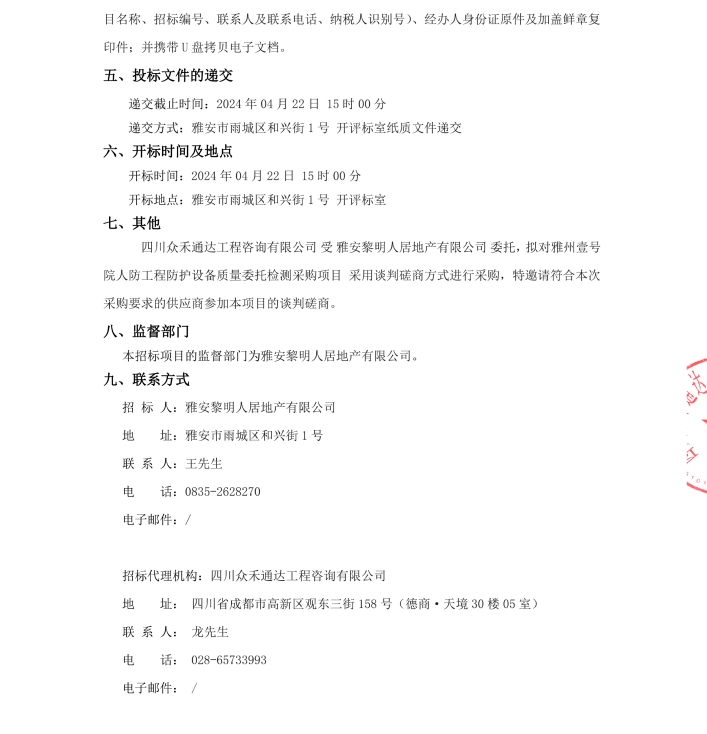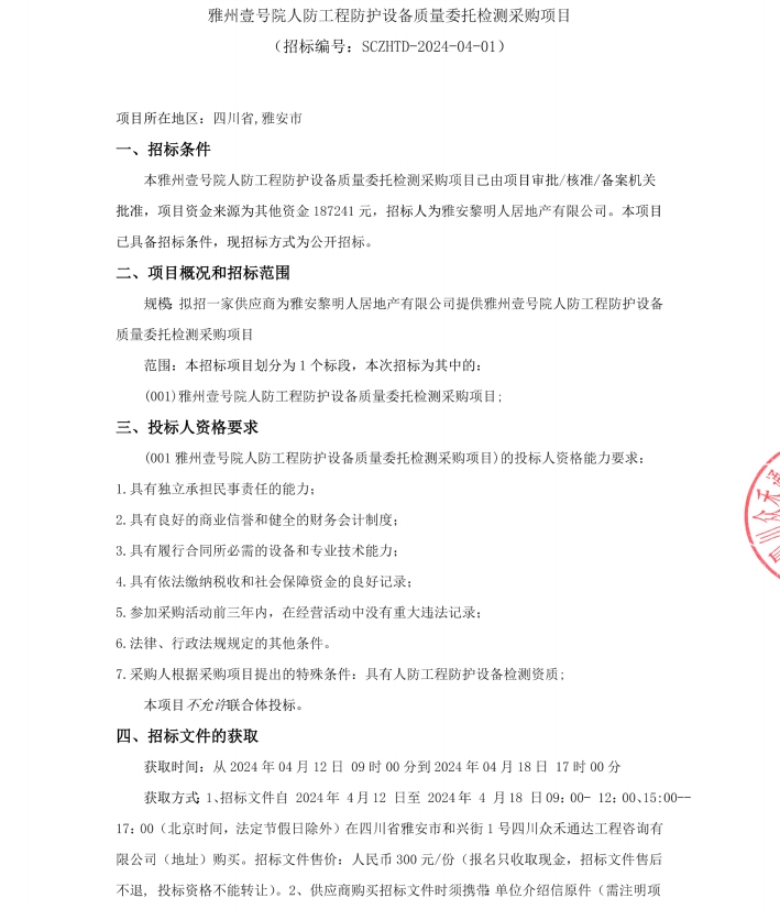 雅州壹號(hào)院人防工程防護(hù)設(shè)備質(zhì)量委托檢測(cè)采購(gòu)項(xiàng)目公告
