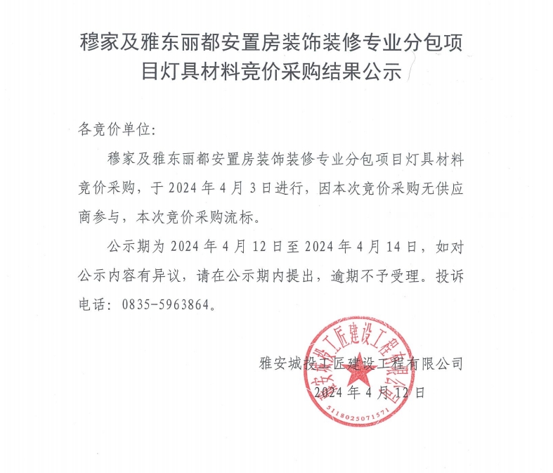 穆家及雅東麗都安置房裝飾裝修專業(yè)分包項(xiàng)目燈具材料競(jìng)價(jià)采購(gòu)結(jié)果公示