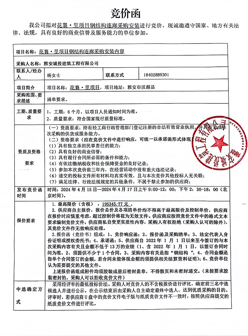花襄·里項(xiàng)目鋼結(jié)構(gòu)連廊采購安裝競價(jià)公告