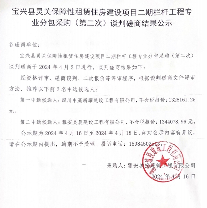 寶興縣靈關(guān)保障性租賃住房建設(shè)項(xiàng)目二期欄桿工程專業(yè)分包采購(第二次)談判磋商結(jié)果公示