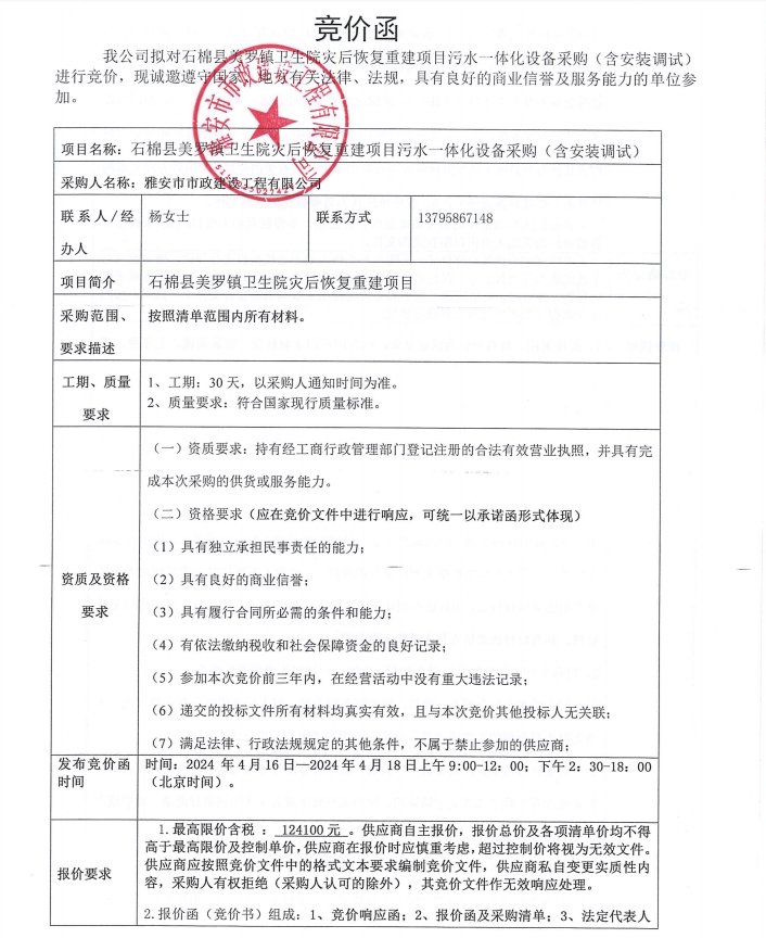 石棉縣美羅鎮(zhèn)衛(wèi)生院災(zāi)后恢復(fù)重建項(xiàng)目污水一體化設(shè)備材料采購(含安裝調(diào)試)競價(jià)公告