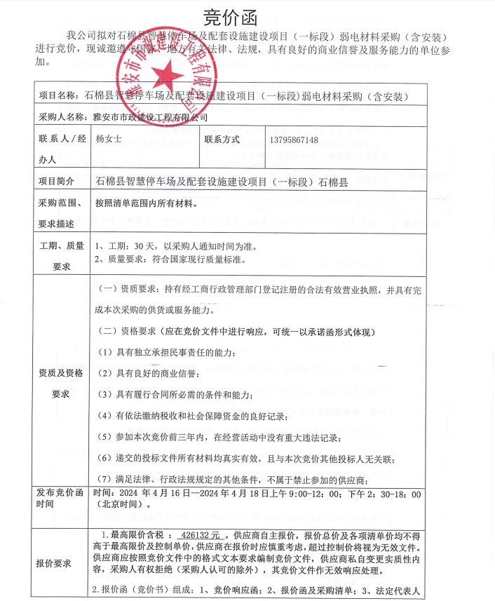 石棉縣智慧停車場(chǎng)及配套設(shè)施建設(shè)項(xiàng)目(一標(biāo)段)弱電材料采購(gòu)(含安裝)競(jìng)價(jià)公告